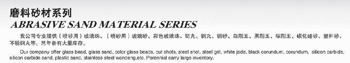 我單位可以提供(噴(pen)砂(sha)(sha)用(yong))夾層安(an)全(quan)玻璃紙(zhi)珠、(噴(pen)砂(sha)(sha)用(yong))夾層安(an)全(quan)玻璃紙(zhi)砂(sha)(sha)、采(cai)色(se)夾層安(an)全(quan)玻璃紙(zhi)珠、切丸(wan)、鋼丸(wan)、鋼砂(sha)(sha)、白剛玉、黑剛玉、棕剛玉、無(wu)定(ding)形(xing)碳硅(gui)砂(sha)(sha)、塑膠砂(sha)(sha)、裝飾管丸(wan)等(deng)。多(duo)年具有(you)過多(duo)貨源。