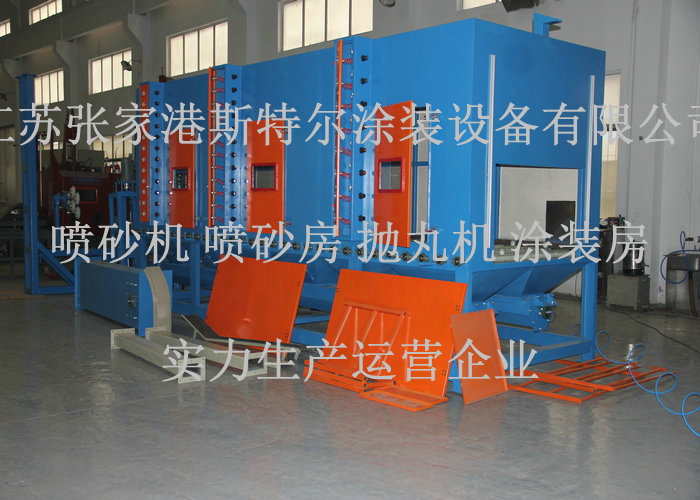 方形坩堝產品內壁處理要求而專門設計的專用型輸送式自動噴砂機,適合需求公司所提供的產品。根據需求公司對產品效率的要求,本機設置一套自動輸送線,共分五段線體。噴砂艙內共設三個噴砂位,工件通過輸送線體帶動步進方式分別在三個噴砂位進行噴砂加工清理,噴砂區域內共布置20支普壓高速噴砂咀,在噴砂區第一個噴砂位布置8支噴咀噴工件內底面,在噴砂區第二個噴砂位布置6支噴咀噴工件內前后側面,在噴砂區第三個噴砂位布置6支噴咀噴工件內左右側面,噴咀可根據加工需要,適當調整其噴射角度,其自動化程度較高。每個工件需間歇進行三次噴砂清理加工,才能完成整個內表面的清理。在出口處設有翻轉機構,用于傾倒內部的砂料,該動作自動完成,無需人工操作。 噴砂生產工藝注意事項
